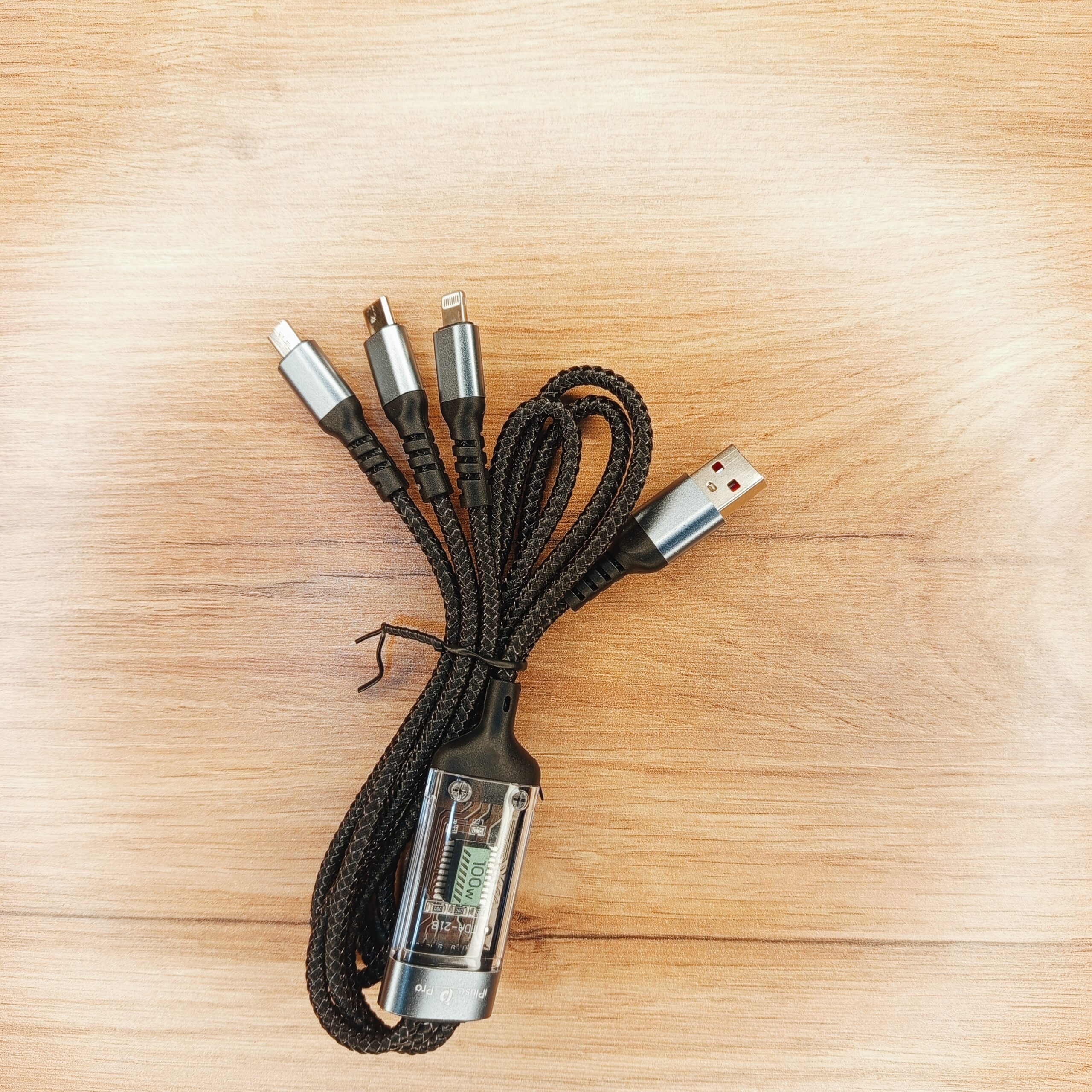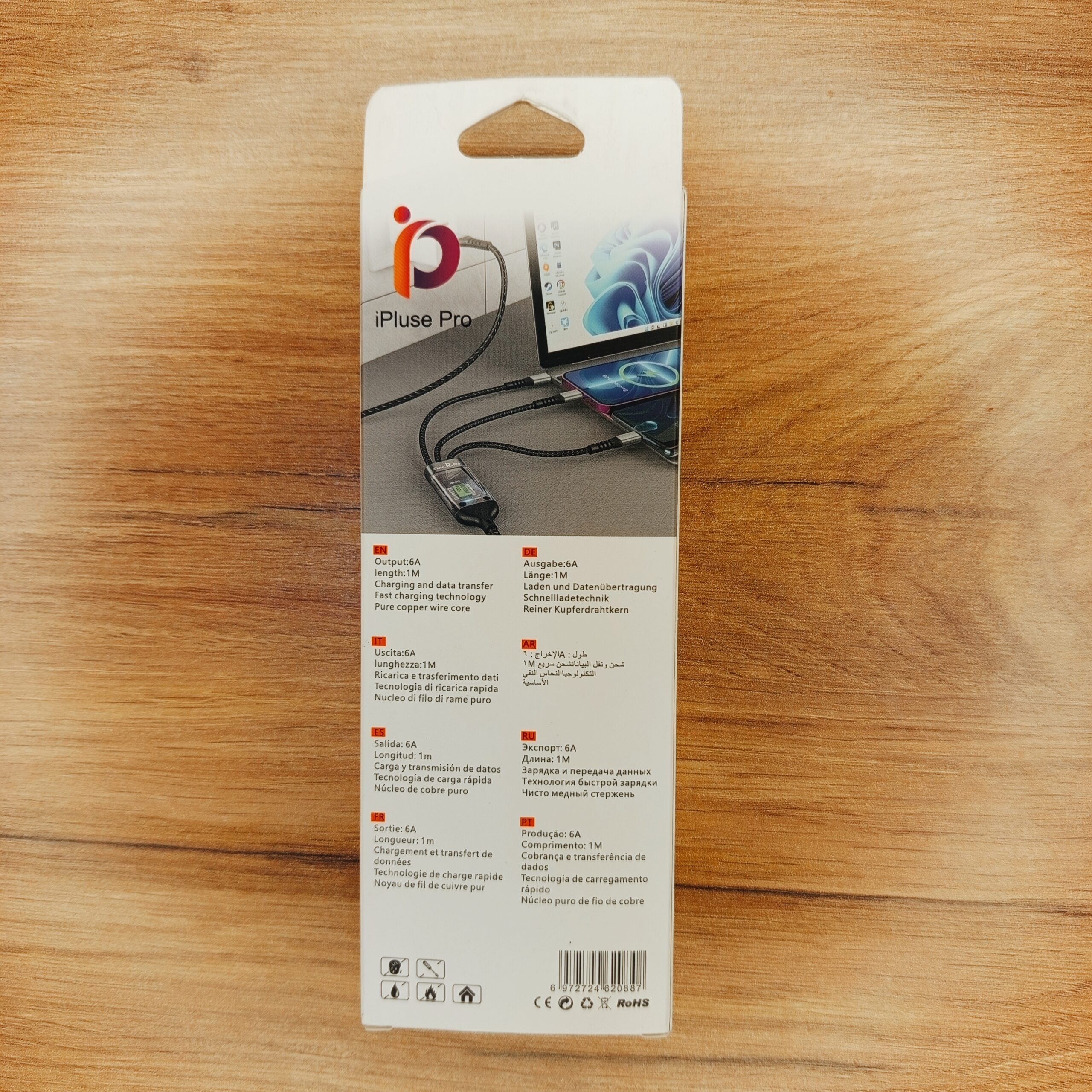 iPluse Pro 3-in-1، کابل چندکاره حرفهای با نمایشگر دیجیتال توان، پشتیبانی ۱۰۰ وات PD و سه سر (Type-C + Lightning + Micro-USB)! روکش نایلون بریدد، هسته مس خالص، چیپ هوشمند – شارژ سریع + انتقال داده برای آیفون، اندروید، لپتاپ و پاوربانک.